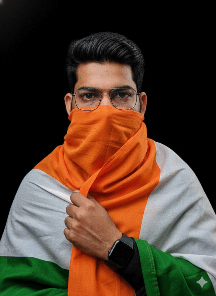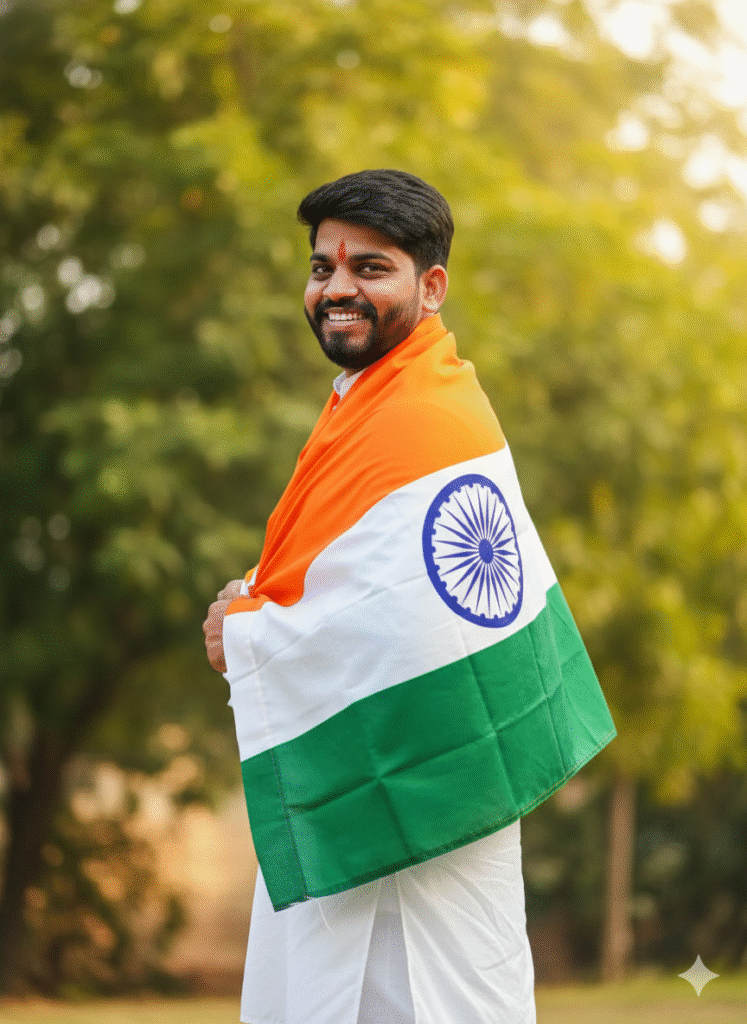 “Wrapped in pride, smiling with freedom🇮🇳Create a vibrant portrait of a joyful young man celebrating Indian pride, wrapped in the Indian national flag (tricolor with Ashoka Chakra). He is dressed in a traditional white kurta-pajama, smiling and glancing back over his shoulder. The background features soft greenery and warm lighting, emphasizing the festive and patriotic atmosphere. High-resolution, natural colors, lively and celebratory mood, I style.”