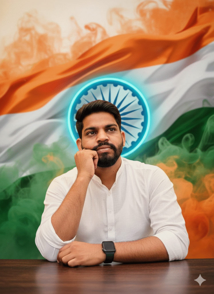 Use the uploaded photo to generate a highly emotional and patriotic portrait of this person. Recreate the same pose as shown: the person sitting at a wooden desk, wearing a traditional white kurta with sleeves rolled up, resting their head gently on their right hand, and looking upward thoughtfully with pride. Add a black smartwatch on their left wrist. In the background, show the Indian flag waving with swirling saffron, white, and green smoke, and the Ashoka Chakra behind their head like a glowing halo. Keep the lighting warm and soft, emphasizing a proud, hopeful, and vibrant Indian Independence Day atmosphere.