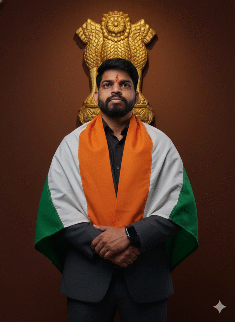 A POWERFUL, ULTRA-REALISTIC PORTRAIT OF A CONFIDENT INDIAN MAN STANDING IN FRONT OF THE ASHOKA PILLAR EMBLEM, WEARING A FITTED BLAZER AND FORMAL TROUSERS. THE INDIAN TRICOLOR FLAG IS DRAPED OVER HIS SHOULDERS LIKE A SHAWL, WITH THE FLAG WRAPPING NATURALLY AROUND HIS BODY AND RESTING OVER ONE SHOULDER. HIS HANDS ARE CALMLY FOLDED IN FRONT, AND HIS HEAD IS TILTED SLIGHTLY UPWARDS, AS IF IN DEEP PRAYER OR EXPRESSING GRATITUDE TO GOD. THE LIGHTING IS RICH AND DRAMATIC, WITH A ROYAL BROWN BACKGROUND HIGHLIGHTING THE NATIONAL SYMBOL BEHIND HIM. HE WEARS A SMARTWATCH, AND HIS EXPRESSION IS HUMBLE, PROUD, AND FULL OF PURPOSE – BLENDING PATRIOTISM WITH QUIET STRENGTH.