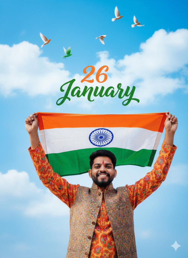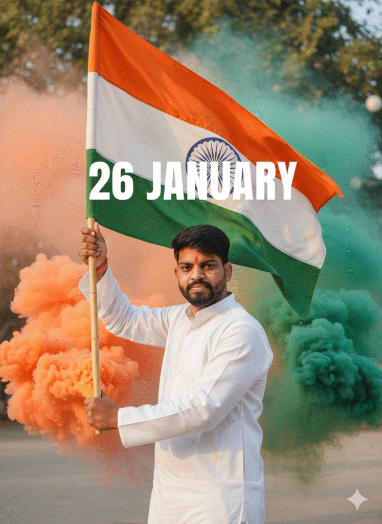 A young Indian man proudly holding the Indian national flag, wearing a white kurta, confident expression, soft sunlight, cinematic portrait style, tricolor smoke in the background, bold text “26 January” written behind him, ultra-realistic, high detail, shallow depth of field