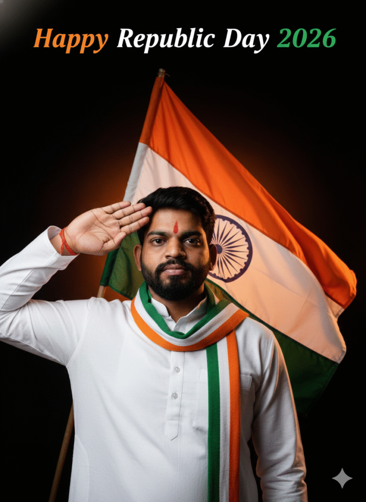 Create a picture of an Indian man saluting the Indian flag. He is wearing a white kurta with a scarf of Indian colors such as saffron, white and green wrapped around the neck.There is also an Indian flag just behind the man. The background is black in color with orange colored light coming from it which is also falling slightly on the man’s face. In which Happy Republic Day 2026 is written in a tricolor themed font. Which is on the top side of the Indian tricolor