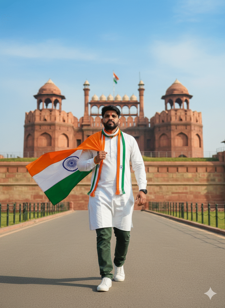Keep my face exactly the same as the uploaded photo. Do not change or edit my face in any form. 100% exact face match is strictly required. Create an ultra-realistic cinematic Republic Day lifestyle portrait using the uploaded reference photo. FACE & IDENTITY (STRICT) • Face must be 100% identical to the uploaded reference • No reshaping • No beautification • No AI enhancement • Natural human skin texture preserved • HD face clarity clearly visible SUBJECT • A young Indian man walking confidently at Red Fort, Delhi • Full body visible • Strong patriotic energy and confidence POSE DETAILS (COMPLETELY DIFFERENT) • Captured mid-walk, moving forward • Indian tricolor flag resting on shoulder, held firmly • One leg stepping forward confidently • Free arm swinging naturally • Body facing forward • Chin slightly raised • Eyes looking ahead with determination OUTFIT DETAILS (TRICOLOR STYLE) • White kurta or t-shirt base • Saffron scarf flowing with movement • Green jacket or pants accent • Clean white sneakers • Mode