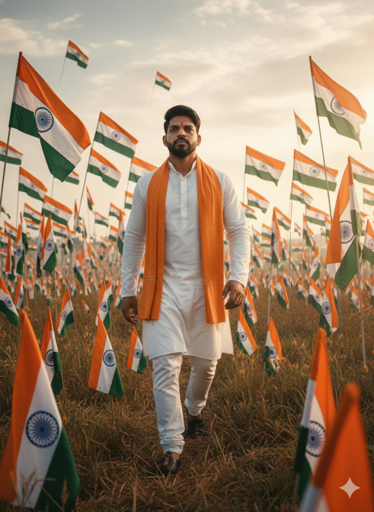 A CONFIDENT YOUNG INDIAN MAN WALKING FORWARD WITH PURPOSE THROUGH A FIELD OF COUNTLESS INDIAN FLAGS WAVING PROUDLY IN THE WIND. HE WEARS AN ELEGANT WHITE KURTA AND CHURIDAR, WITH A VIVID SAFFRON SCARF DRAPED OVER HIS SHOULDERS. HIS CALM, DETERMINED EXPRESSION RADIATES STRENGTH AND HOPE. THE DRAMATIC SKY AND WARM CINEMATIC LIGHTING CREATE A POWERFUL PATRIOTIC ATMOSPHERE. EPIC PERSPECTIVE, FLAGS FILLING THE BACKGROUND TO AND NATIONAL PRIDE.