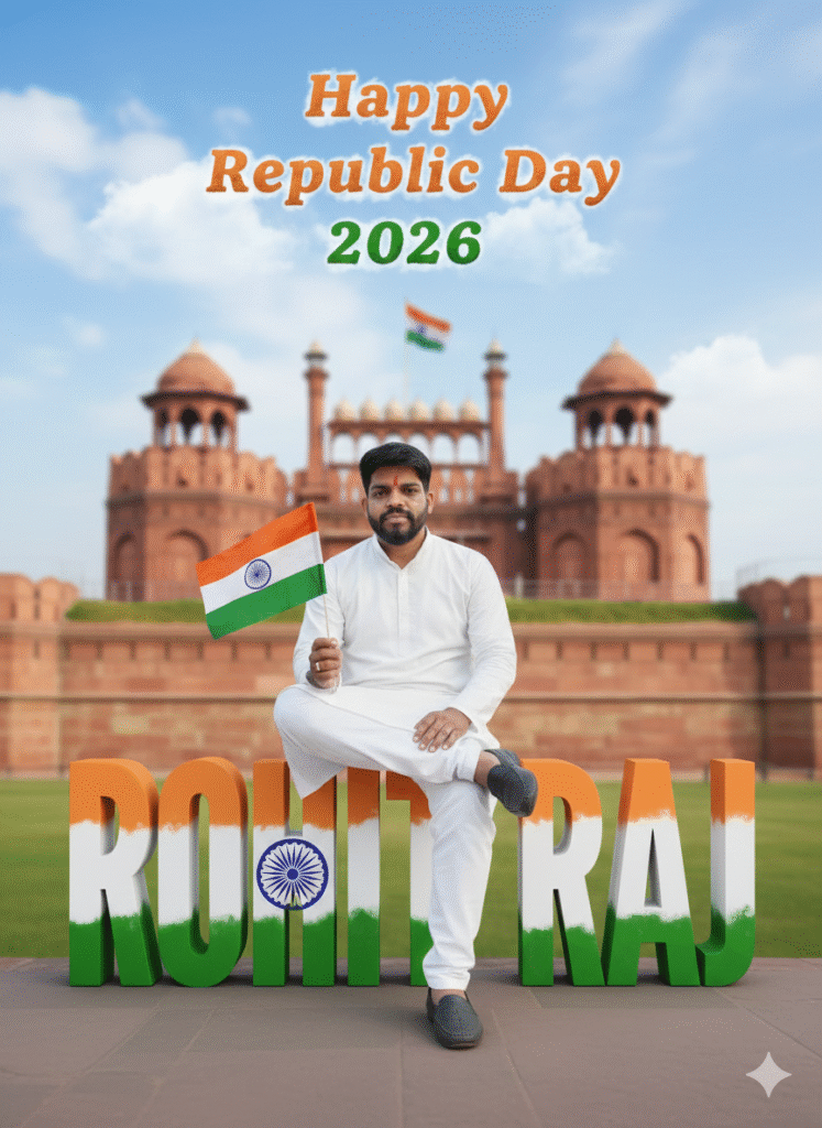 Create a 3D illusion image of a 22-year-old boy/girl sitting comfortably on a giant 3D text that says “[YOUR NAME]” in tricolor (Saffron, White, Green). The subject is wearing a white traditional kurta and holding a small Indian flag. The background features the Red Fort with a soft bokeh effect and “Happy Republic Day 2026” written in the sky with clouds. 4k, hyper-realistic.