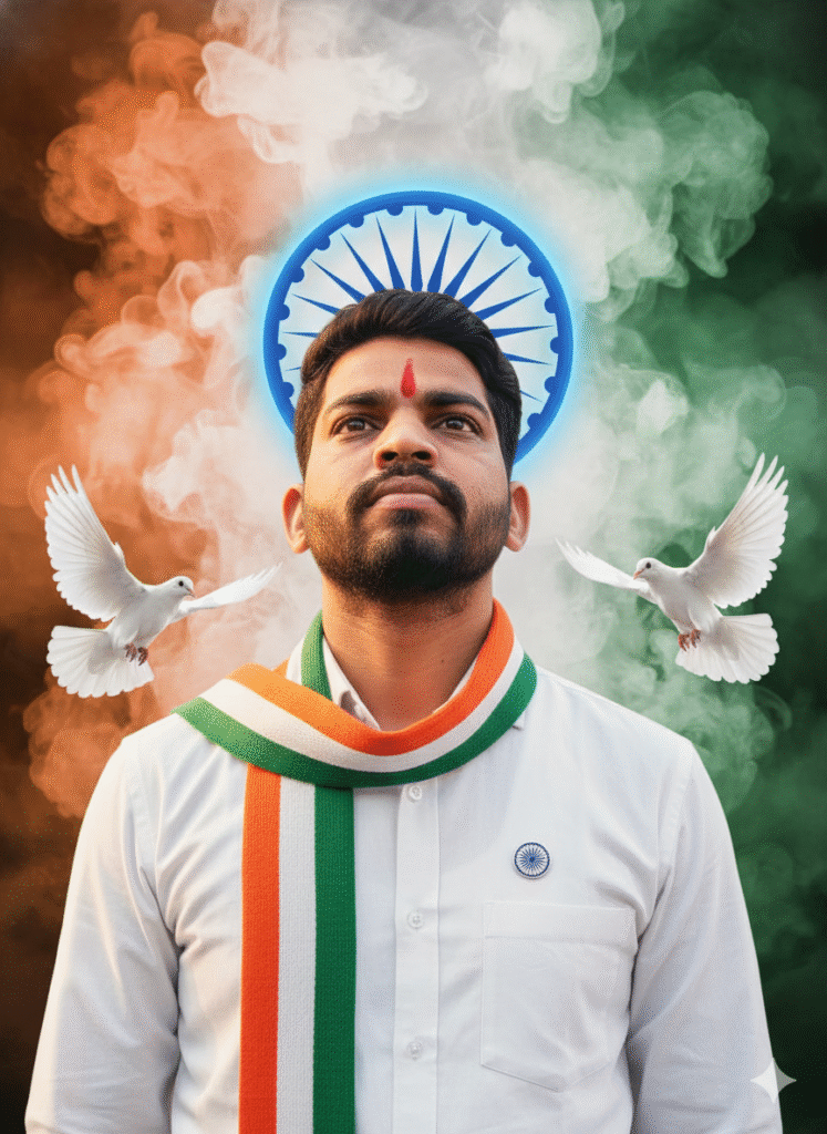 “26th Januaryspecial”A powerful patriotic portrait of a young Indian man looking upward with pride and hope. He wears a crisp white shirt adorned with a tricolor scarf (orange, white, and green) and an Ashoka Chakra badge. Behind him, the Indian flag’s swirling smoke forms a vibrant backdrop with the blue Ashoka Chakra haloing his head like a symbol of unity. Two white doves fly beside him, representing peace and freedom”.