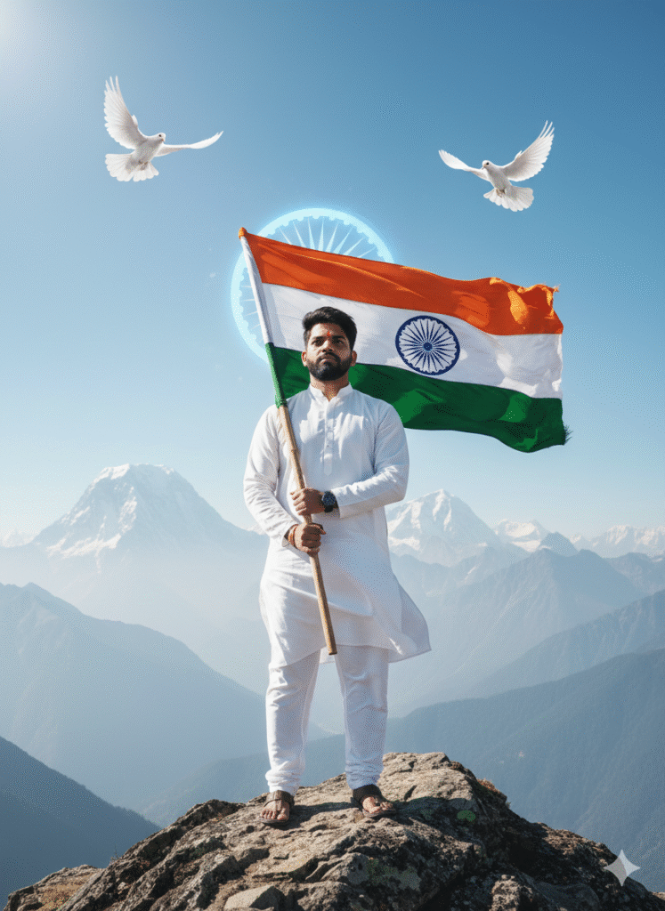 “A powerful and serene digital portrait of a young Indian man standing proudly on a mountain peak, wearing a traditional white kurta-pajama. He holds the Indian national flag firmly in both hands as it waves dramatically in the wind. His face glows with calm pride, gazing slightly upward with hope and dignity. Bright natural daylight bathes the entire scene, enhancing the crispness of the white kurta and the vivid colors of the tricolor. Behind him, the majestic Himalayas stretch into the distance. Two white doves fly across the clear blue sky, symbolizing peace and freedom. The Ashoka Chakra glows faintly behind his head like a spiritual halo, evoking unity and truth.