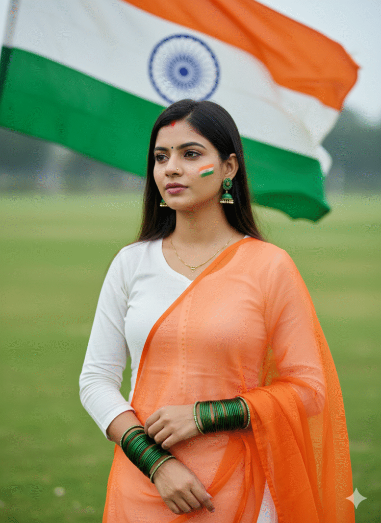 A beautiful Indian Women standing outdoors in front of a large Indian national flag (Tiranga) waving in the background. Additionally, she has long straight dark hair, natural makeup with subtle pink lip, and a small tricolor paint design on her cheek. She is wearing a plain white
