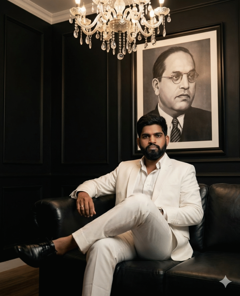 Hyper-realistic cinematic portrait of the man from the reference photo. A confident man sits on a luxurious dark-brown leather sofa in a dark, elegant room with matte black walls and a chandelier hanging above. He is dressed in a white suit with a white shirt, the top buttons casually undone, sitting in a relaxed mafia-boss pose with one leg crossed over the other. His polished black leather shoes are clearly visible. Behind him hangs a large framed black-and-white image of Dr Babasaheb Ambedkar