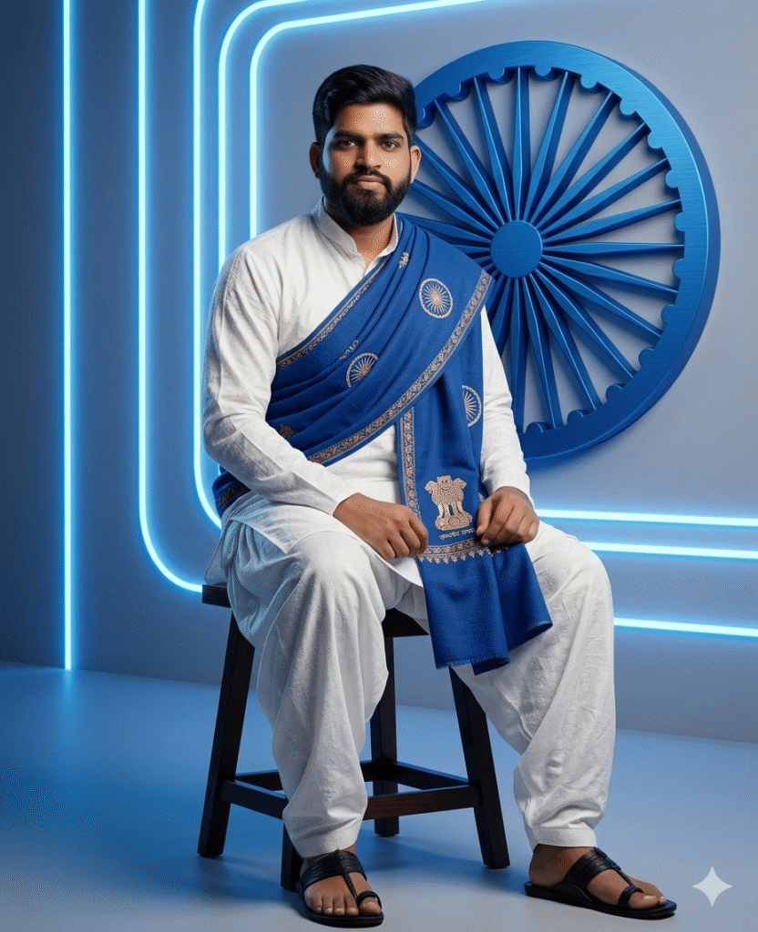 Ultra-photo realistic studio portrait of a man sitting on a classy stool, with glowing blue lights and a bold blue 3D Ashok chakra symbol behind him, styled like a fashion poster. He wears a white patiyala dress and with an blue khesh featuring symbols and black chappal. Realistic skin texture, soft studio lighting, sharp details, and cinematic quality. My face 100% same