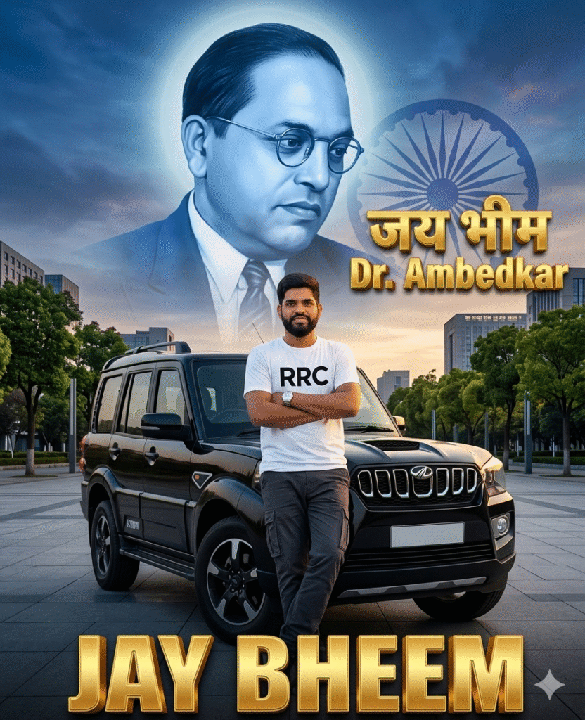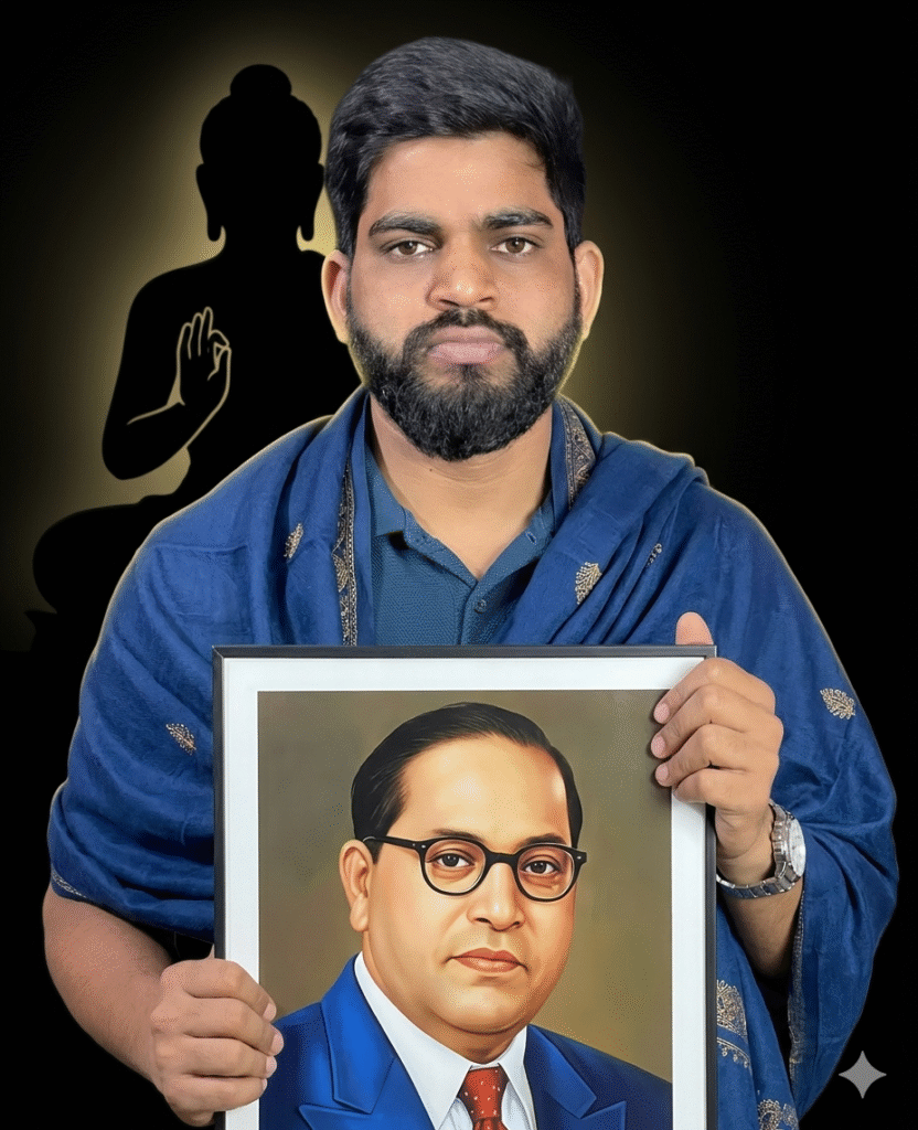 The background features a massive, ethereal blue-tinted portrait of Dr. B.R. Ambedkar. the Ashoka Chakra and “जय भीम” Dr. Ambedkar.