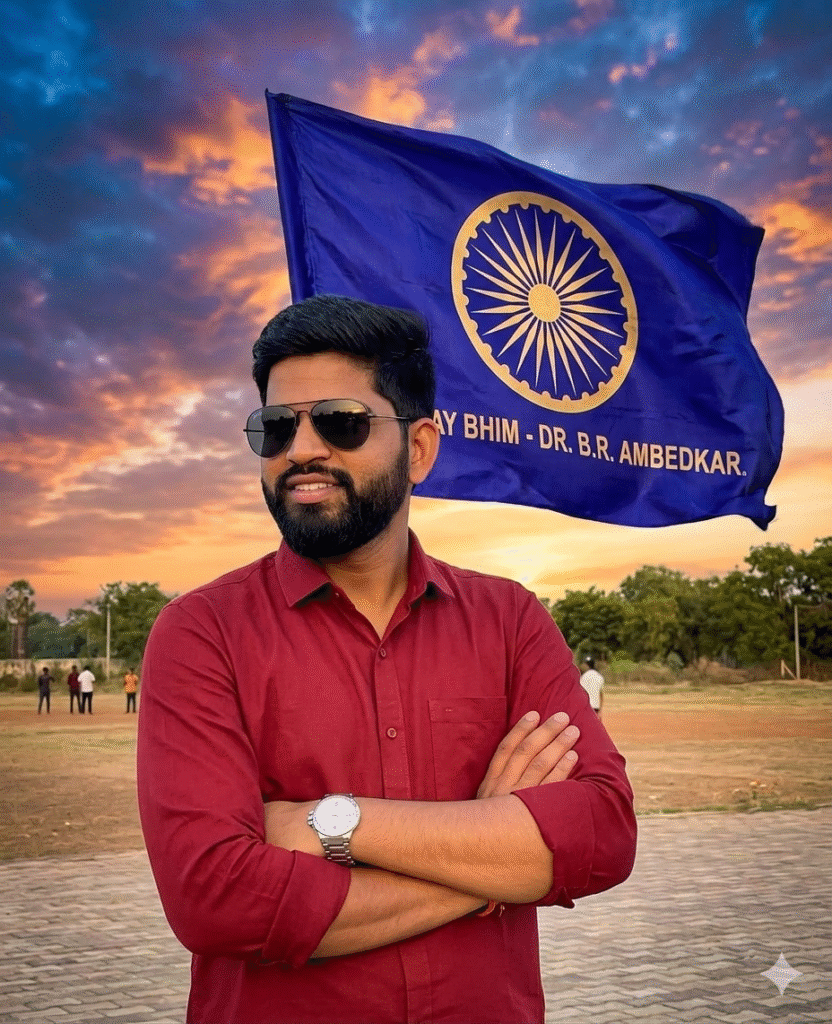 JAY BHIM A confident young Indian man standing outdoors wearing a blue patterned shirt and sunglasses, looking sideways with a slight smile. Behind him a large blue flag waving in the wind with an Ashoka Chakra symbol and text referencing Dr. B. R. Ambedkar. Dramatic sky with sunset light