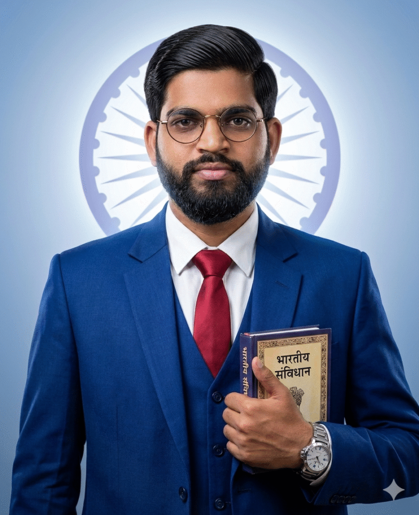 Use Uploaded Photo dressed like young Dr. Babasaheb Ambedkar, wearing a royal blue suit, white shirt, red tie, round vintage spectacles, neatly combed side-part hairstyle, holding a small ifau (भारतीय संविधान ) book close to chest, confident and calm expression, soft studio lighting, blue gradient background, subtle Ashoka Chakra behind, garland decoration, Bhim Jayanti theme, ultra-realistic, high detail, 85mm portrait lens, cinematic lighting, sharp focus