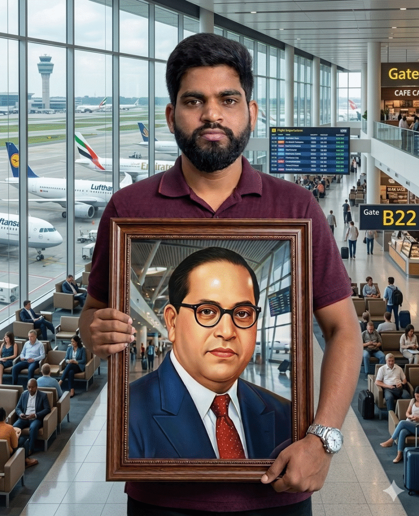 Use My Uploaded Photo. Ultra-realistic 24K RAW cinematic portrait, 8K resolution, shot on 85mm f/1.4 lens. stands in front of cinematic Airport Seen. He holds a large framed portrait of Dr. B. R. Ambedkar with Both hands. The frame is detailed with realistic reflections and glass texture.