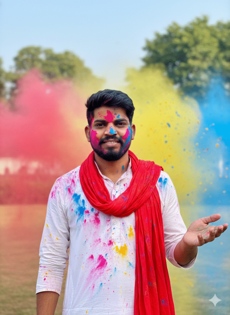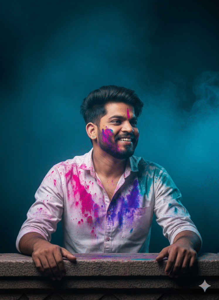 A hyper realistic 8k portrait ofa handsome young Indian man celebrating Holi. He is wearinga white shirt splattered with pinkand yellow colors and is adjustinga bright orange fabric headband (gamcha) on his forehead with both hands. His face has artistic smearsof yellow and pink gulal. The background is pitch black but filled with dramatic, exploding cloudsof vibrant blue, purple, and red Holi powder, creating a cinematic smoke effect. High contrast, studio lighting sharp focus, ultra detailed skin texture, photorealistic masterpiece Seme face