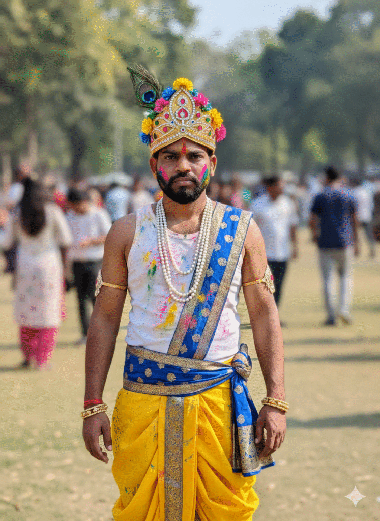 “Use the uploaded photo as the main face and person reference. Keep the same face, same facial features, same skin tone, and same expression. Do not change the identity. Transform the outfit into a cute traditional Krishna-inspired Holi outfit: yellow dhoti, blue and gold sash, pearl necklaces, golden waistband, bangles and anklets. Add a decorative peacock feather crown with colorful flowers and jewels. Add soft colorful Holi powder (pink, yellow, blue, green) on face and clothes. Outdoor park background with blurred people celebrating Holi. Natural daylight, vibrant colors, shallow depth of field, realistic photography, ultra detailed, DSLR quality, 4K.”