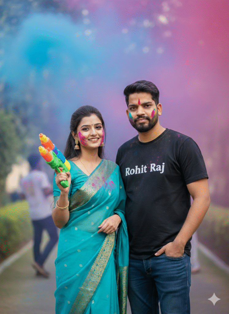 Use the uploaded male photo and uploaded female photo as the PRIMARY and ONLY face references.Both faces must match 100% exactly — same identity, facial structure, skin tone, eyes, nose, lips, hair, and expressions.Do NOT change faces. Do NOT beautify excessively.NO anime, NO cartoon, NO illustration. Faces must be fully realistic and photographic.Create a realistic Indian Holi couple photoshoot scene.A stylish young Indian couple standing together confidently.Female look:– Wearing a beautiful turquoise / blue saree with golden border– Traditional Indian jewelry (earrings, bindi, light makeup)– Holding a colorful pichkari (water gun) in hand– Natural smile, elegant poseMale look:– Wearing a black t-shirt and dark jeans– Name text like “Alok” written on the t-shirt (customizable)– One hand in pocket, other resting casually– Confident and stylish postureHoli details:– Natural gulal colors on faces and clothes (pink, blue, yellow, green)– Color smoke in the background– Festive Indian outdoor location (garden / village lane)– People celebrating Holi softly blurred in backgroundPhotography & Quality:– DSLR camera look– Cinematic natural daylight– Ultra-realistic skin texture– Sharp focus on both faces– Soft background blur (bokeh)– High dynamic range– 4K ultra-HD resolutionMood:– Romantic– Festive– Stylish– Joyful Holi celebrationFinal image must look like a REAL professional photoshoot, not AI generated. Same Face