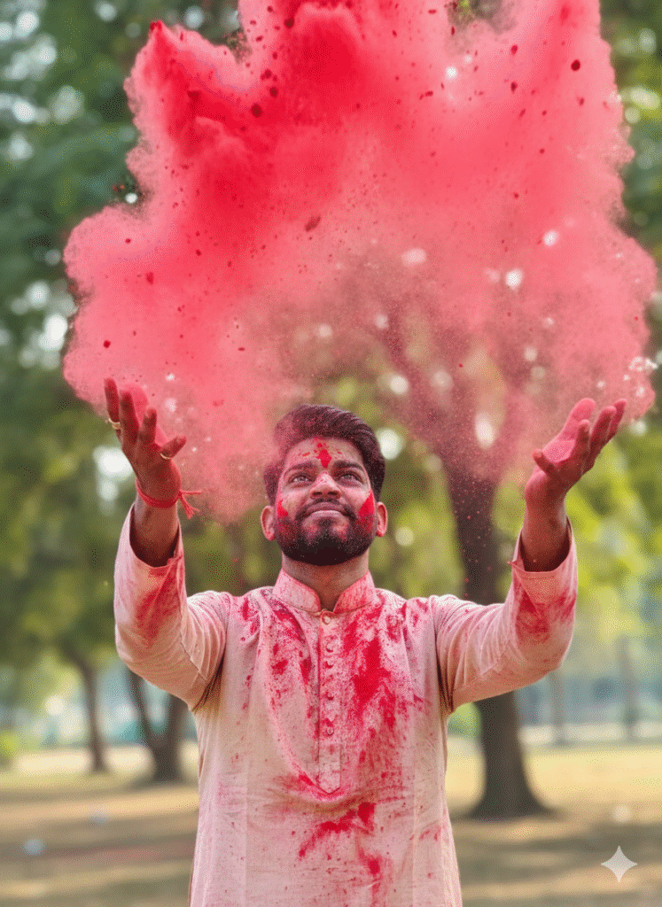 A young Indian man celebrating Holi, tossing bright red color powder (red gulal) into the air with both hands. He is wearing a stylish light beige kurta splashed with red color, smiling softly and looking upward. Red gulal particles frozen mid-air around his face, creating a dramatic dynamic splash effect Natural outdoor background with trees and soft blur (bokeh). Bright daylight, cinematic lighting, shallow depth of field. Realistic skin texture, expressive eyes, joyful festive mood.