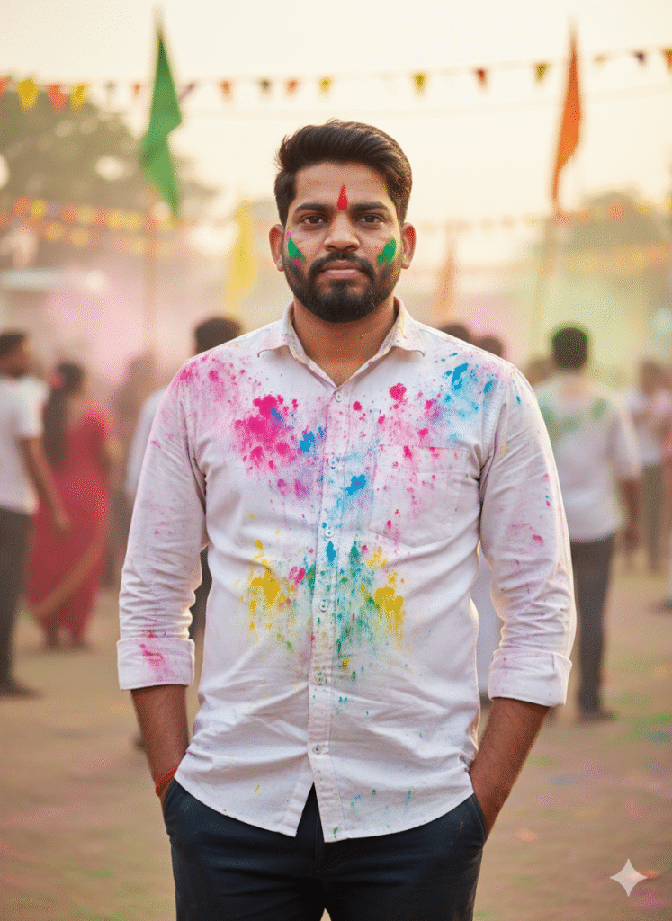 lera-reaustic cinemati ortrait or a young Indian mal leaning forward with both hands on a rough ledge, wearing a white button-down shirt splashed with vibrant Holi colors (pink, purple, teal across chest and sleeves, colorful powder onface, stylish side-swept