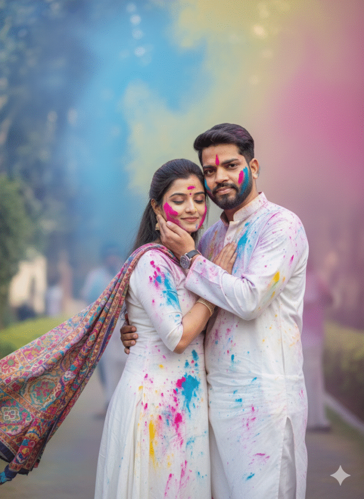 Holi Couples prompt celebrating Holi, the festival of colors. The man is embracing the woman from behind, with his hand gently touching her face, which is smeared with pink and red Holi powder.Both are dressed in white outfits that are also stained with colorful powders. The woman has a colorful dupatta draped over her shoulder, adding to the festive look. Her eyes are closed, and she has a gentle smile